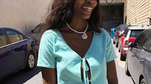 What better way to incorporate a pop of color and print than this minty gingham top from Lisa Says Gah? Try it with wide-leg white denim and a few eccentric accessories (think scrunchie and fruit-bedecked jewelry).