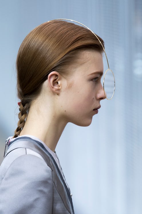 "The inspiration came from Thom, and he said that women are the new men," lead hairstylist Eugene Souleiman tells me backstage at the show, held at Paris' National School of Fine Arts. "For me, men really don’t wear their hair like this anymore. They have a very different way of wearing their hair. I wanted to do something that made the women feel not just beautiful, but almost handsome. Instead of a gentleman, we’re doing a gentlewoman." Souleiman's take on the "gentlewoman" included a defined part with just a little bit of lift at the root. "I wanted to do something that felt considered... nothing rough or vulgar, very tailored," he says. "Not pared-down, but simple and really well-crafted. It's not about getting it to look raw or wild or abstract or anything like that. It's really about doing something that's very groomed and perfect."