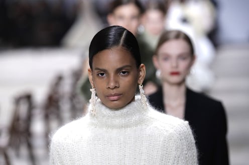 Get the look: Binary hair was the look du jour this season, making way for an army of sleek, slick, masculine-looking side parts. At Versace, lead hairstylist Guido Palau opted for boyish low ponytails. "It’s a nod to the boyish feeling that Donatella was looking for,” he told Vogue. To achieve the look, he blew the hair out with Redken's No Blow Dry Cream, gathered it in a low ponytail, and sprayed it down with hairspray. A clip-in extension that was razored into bangs gave added flair.