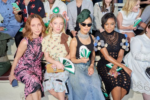 Over the weekend, Miuccia Prada made magic on the runway at Hippodrome d’Auteuil, a centuries-old Paris racing track — with the 52-look Miu Miu Resort 2020 collection. As top models tromped down the racetrack which dates back to 1873, the crowd was wowed by voluminous puff-sleeved blouses with plunging embroidered collars, crystal-adorned tea dresses, extra-floppy sun hats, and the most buttery-smooth leather shorts you ever did see. But aside from the eclectic lineup of structural, patterned, awe-inspiring looks from the Italian fashion house, the Miu Miu Croisiere 2020 Show included seriously stunning celebrity style that's absolutely worth taking note of.