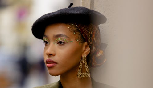 This show-goer swiped an emerald green shadow on her lids. To give the look extra oomph, she added green sequins under her eyes.