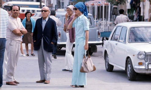 Jackie Kennedy Onassis's style took a relaxed, effortlessly cool turn once the '70s came around. She embraced pared-down separates styled with bohemian accessories, like oversized sunglasses and the scarf shown above.