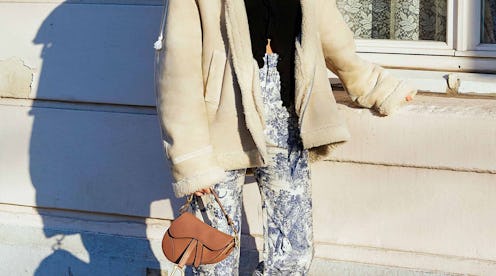 Camille Charrière's Toile de Jouy pants add excitement to classic staples, like her shearling bomber and cardigan. If you're planning to try the trend with trousers, too then simply style them with solid neutral layers for a quick and easy spring look.