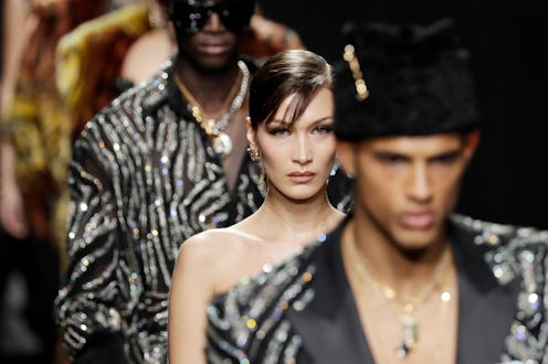If there's one thing that Versace's shows are known for, it's for celebrating feminine energy. Last season, for example, Jennifer Lopez graced the runway in her iconic, cut-down-to-there silk chiffon dress. For the brand's Spring/Summer 2018 show, Donatella Versace strutted down the runway with five of the label's most iconic models from the '90s. But at the Versace Fall/Winter 2020 show in Milan on Feb. 21, there was a different type of energy in the room. Specifically, masculine energy.