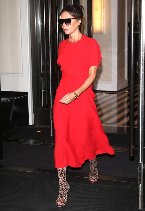 The key to nailing this look is to pair up a neutral animal print boot with a streamlined silhouette in a solid color, and while Victoria went for a bold hue, you can certainty opt for a more muted tone, too. The brown and tan color palette of a leopard-print boot (like Victoria's) makes it easy to match up with pretty much any color you throw at it — a likely reason for why this print has continued to be so popular the last couple of seasons.