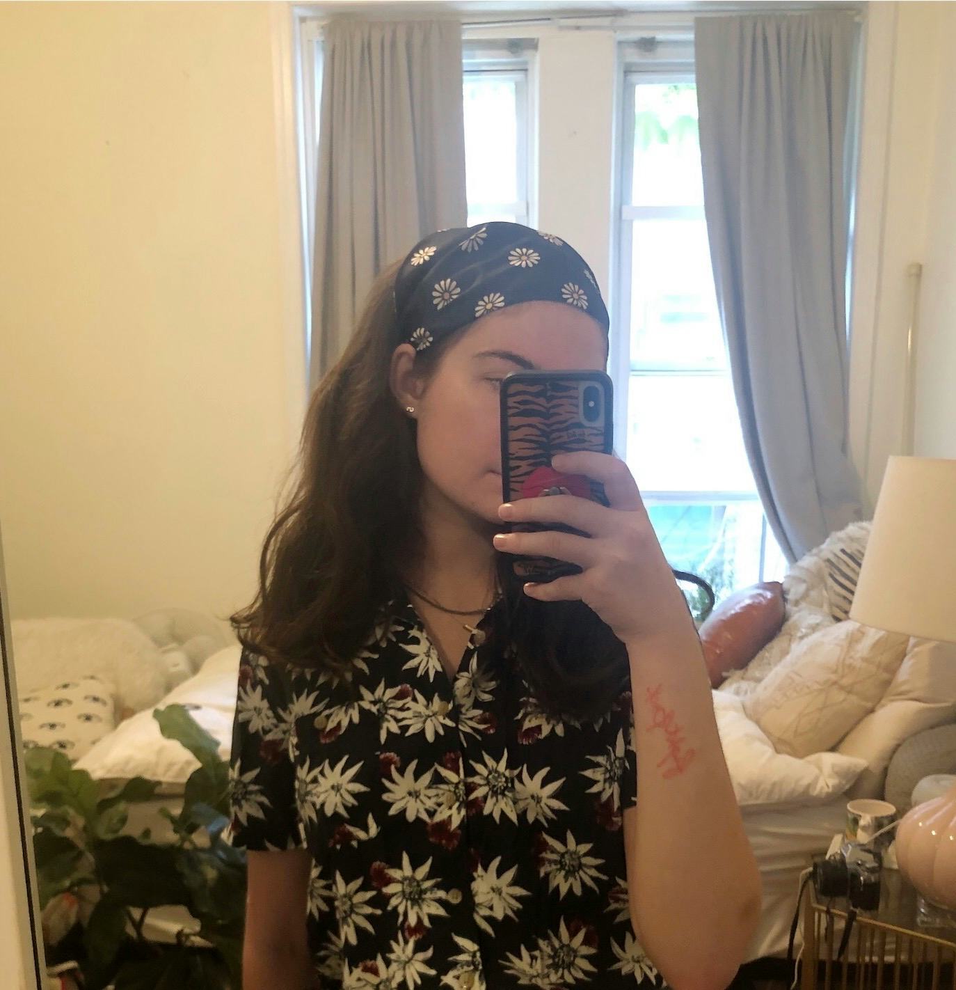 My group will most likely be playing card games and charades while hanging around the cabin, so I'll be dressing fun while cackling over Cards Against Humanity. My go-to adventurous look is pairing together two funky prints, which I'm planning on doing with a floral "dad" shirt and daisy scarf. To finish off the look, I'm opting for a pair of Madewell denim cutoffs.
