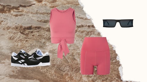 Since you're climbing up a canyon, in what we can only assume will be direct sunlight and warm temperatures, you don't want full-length leggings or running shorts. Leggings will be too warm, and you'll want to tear them off at the peak and run down in your underwear. Running shorts leave little to the imagination for the poor souls scaling the mountain behind you. Cycling shorts are therefore the perfect option, particularly when paired with a coordinated sports-bra-cum-top in dusty rose. Finally, if you must bring your phone, stash it in a belt bag, along with keys and sunscreen.