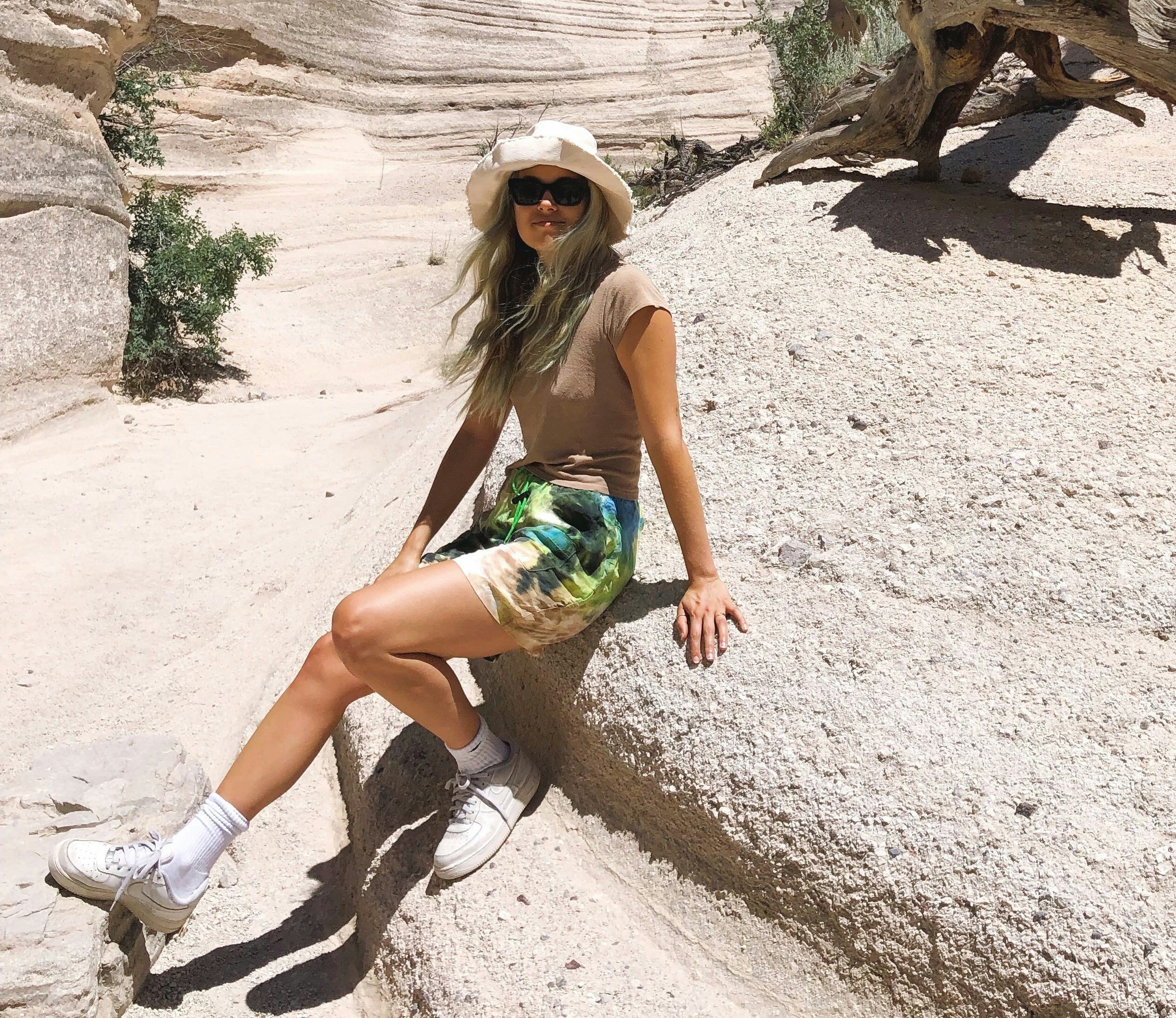 For a day hike of a few miles, keeping things casual is totally fine. Leggings or bike shorts, a tee, and protective gear like a hat and sunglasses is a combo that is practical but also on trend.