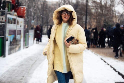 Cold weather offers you ample opportunity to wrap, layer, and enrobe yourself in all sorts of dreamy textures. As for snowy weather, that takes a bit more plotting to pull off. The same layered looks are an option, but you'll need to make sure what you're wearing can hold up to a little dusting. Luckily, practical and on-trend aren't mutually exclusive categories. What you wear in the snow can be as colorful and quirky as you desire — just as long as you know you won't slip on an icy sidewalk or ruin something delicate that can't handle a little precipitation.