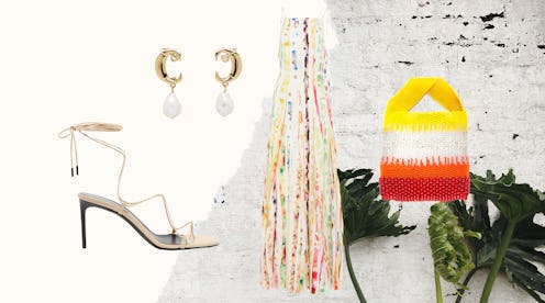 Opt for something elegant yet punchy, like this Rosie Assoulin dress, as the foundation for your look. The pleated cotton fabric is breezy enough for even the most sweltering affair without looking casual. The silhouette pairs best with minimalist sandals (extra points if you can rewear them for the ceremony, thus salvaging a little extra suitcase real estate). Underscore the vibrant hues of the dress with an eye-catching beaded bag, like this multicolored style from Truss, which is made by hand by women artisans in Oaxaca, Mexico, and benefits the education nonprofit Fondo Guadalupe Musalem in the same community. Round out the look with a pair of sculptural pearl-and-gold earrings. There's no reason why dressing up for the rehearsal dinner can't be as fun as getting decked out for the wedding itself — especially when you have these pieces in your wardrobe.