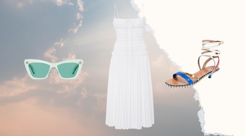 While there will be a breeze, it likely won't be much cooler on the roof, so wear a thin-strapped poplin dress. Khaite's Delphine Smock Dress is sophisticated yet laid-back, and can take on multiple personalities depending on your accessories. For sunset cocktails, pair the dress with studded wrap sandals, like this color-blocked pair from Marni. Playful and summery, the low heel makes these ideal for climbing stairs and traversing uneven rooftops. Finally, the perfect sunglasses feature a soft lens that won't render you unable to see in the evening light but will protect you from the sunset glare from surrounding buildings. This style from Ferragamo strikes the perfect balance, all in a refreshing aqua shade.