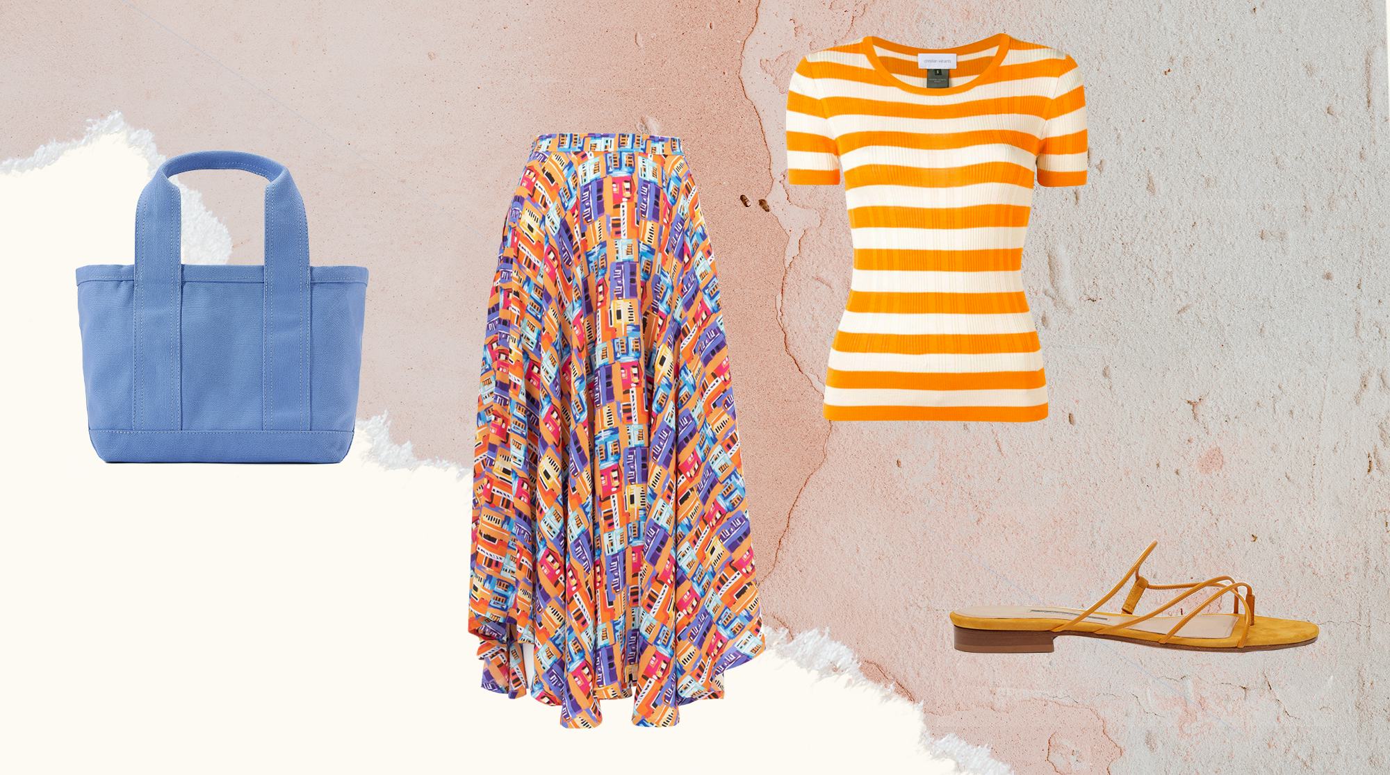 Since no one in their right mind goes to brunch without sunglasses, embrace the opportunity to wear vibrant hues and clashing prints. Might as well start the day strong. Reach for a comfortable, swingy skirt in an eye-catching print and build from there. Team the favorable silhouette with an elevated alternative to the ubiquitous tee, like this version from Christian Wijnants. The short-sleeved knit style features joyful tangerine stripes, adding not only a dose of whimsy, but a level of protection against aggressive air conditioning, or should the breeze pick up.
