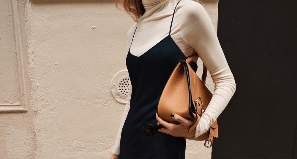 Combat frigid temperatures by layering a tissue turtleneck beneath your slip dress. A pair of low-heel pointed-toe mules to polish things off.
