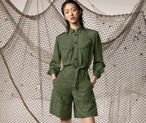 Launched on Jul. 21, Srpls Chptr 4 includes all genders as well as a kids collection. The women's category consists of 32 pieces including apparel, outerwear, footwear, handbags, and accessories. Rhe nautical aspect may be what your eyes settle on first since the numerous variations of white and navy stripes are hard to miss. Despite knotted rope reminiscent of fisherman's knots and brass buttons with raised anchors, the utilitarian theme is just as strong with roomy cargo pants and large patch pockets all over. And possibly least inconspicuous is the distinct military-inspired pieces.