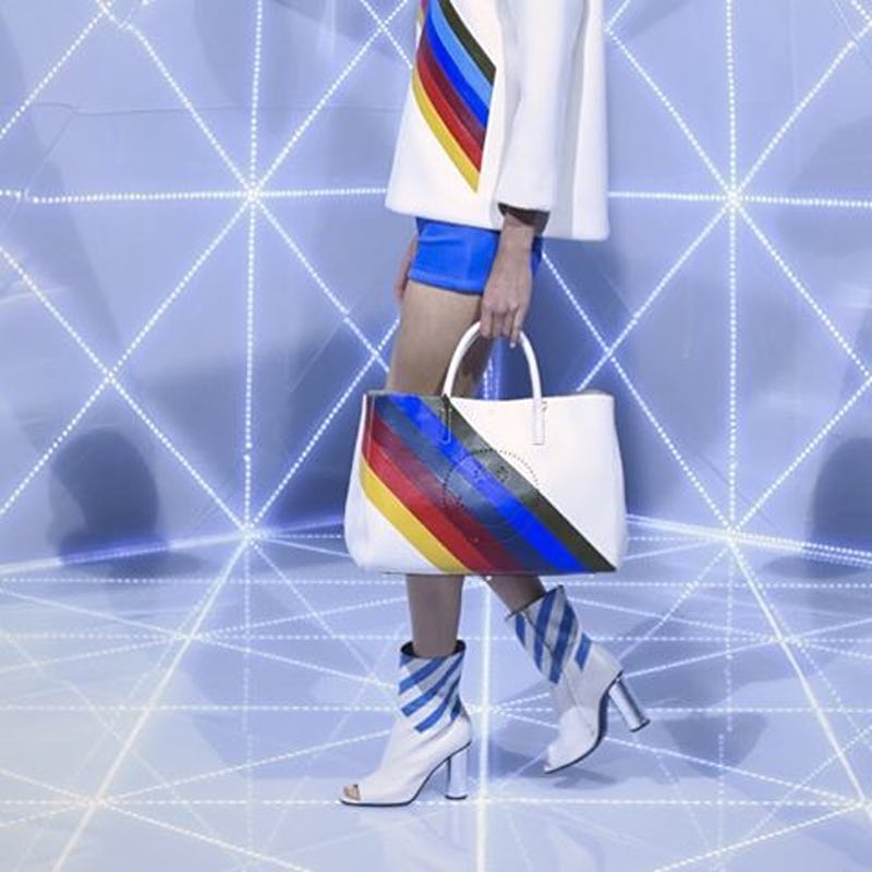 Today in London, accessories designer Anya Hindmarch launched her Spring 2016 line in a spectacular presentation complete with contortionists, neon lights and a backdrop of prism-like mirrors. Although the circus-meets-performance-art format created some serious Instagram fodder, the visual stimulation played backup to the gorgeously graphic collection. Models donned sweatshirts made of scuba-ready neoprene with matching boots and bags decorated with bold chevron prints, kitschy smiley faces and retro rainbows derived from classic UK high street logos. Here, a taste of the event via the gorgeous Instagram images that ensued immediately after the show.